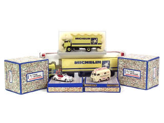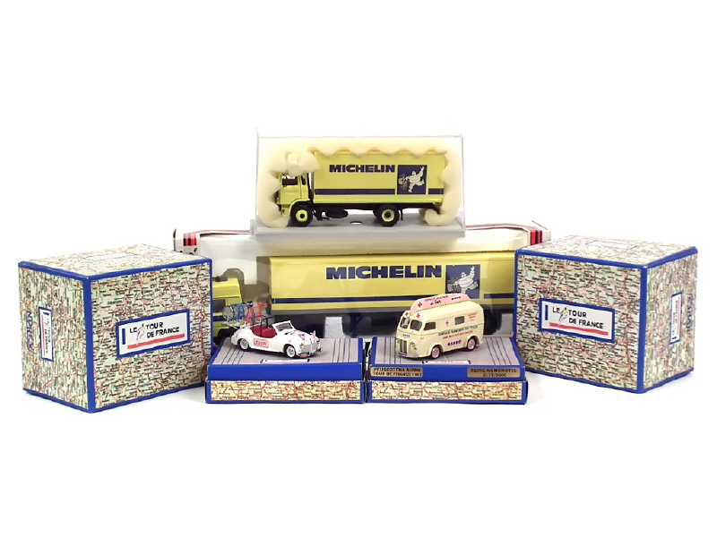 comprend : RENAULT 370 Turbo LEADER semi-remorque MICHELIN, fourgon MICHELIN, PEUGEOT 203 porte-vélos du Tour de France & PEUGEOT D4A 'ASPRO' du Tour de France - on y retrouve les marques : NOREV, CEF REPLEX & LBS