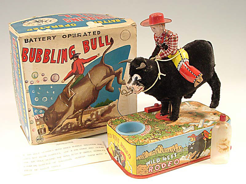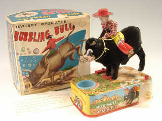 référence 43B du livre de BRIAN MORAN 'BATTERY TOYS' - hauteur 20 cm - en action le cow-boy chevauche un taureau qui fait des ruades - l'animal fait des bulles en se penchant dans un baquet d'eau savonneuse - mécanismes à revoir - avec notice & flacon - in action, the cowboy rides a bucking bull - the animal blows bubbles by leaning into a bucket of soapy water - mechanism subject to verification - with leaflet & flask