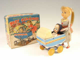 référence 46A du livre de BRIAN MORAN 'BATTERY TOYS' - hauteur 20 cm - en action la jeune fille pousse le landau - le bébé bouge la tête en poussant de petits cris - mécanismes fonctionnent - petites taches sur la robe - in action, the young girl pushes a pram - the baby moves its head & cries - in working condition - small marks on the dress