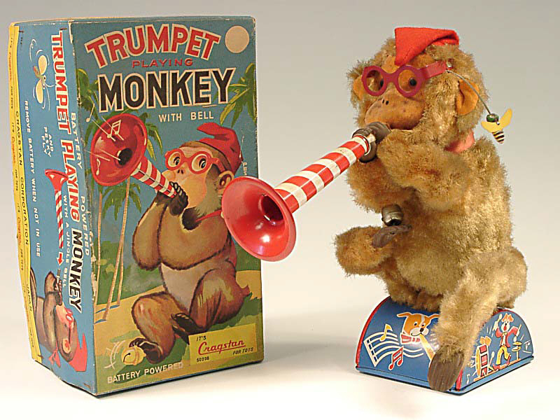 référence 30B du livre de BRIAN MORAN 'BATTERY TOYS' - hauteur 24 cm - en action le singe joue de la trompette & secoue son grelot - avec sa patte de gauche il chasse l'abeille près de son oreille - mécanismes fonctionnent - in action, the monkey plays the trumpet & rings his bell - with his left hand he wafts away a bee from near his ear - in working condition
