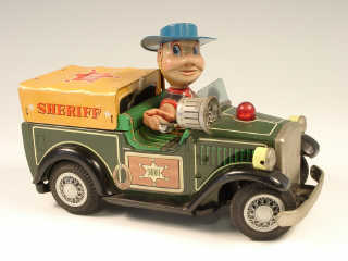 longueur 25 cm - en action le véhicule avance & le conducteur actionne la manivelle de la sirène tandis que le gyrophare rouge de capot clignote - avec bruiteur - mécanismes fonctionnent - ampoule à remplacer - in action, the vehicle moves forward, the driver cranks up the siren as the red light flashes - with sound effects - in working condition - bulb to be replaced