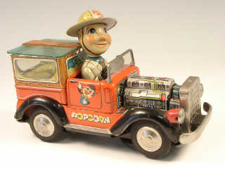 longueur 24 cm - en action le véhicule avance en zig-zag - le pop-corn saute sur une plaque qui s'éclaire - mécanismes fonctionnent - in action, the vehicle zigzags forward - the popcorn jumps about on the hotplate which light up - in working condition