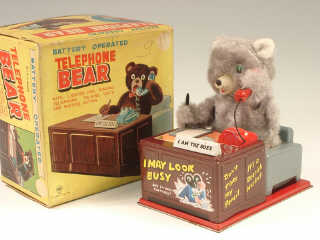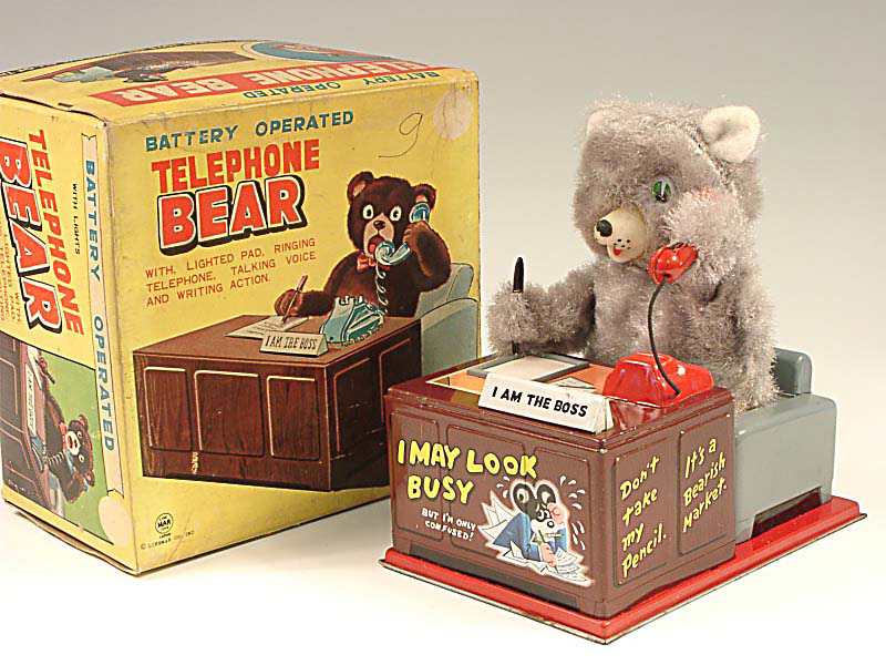référence 12A du livre de BRIAN MORAN 'BATTERY TOYS' - hauteur 19 cm - en action l'ours écrit sur son bloc-notes & décroche le téléphone lorsque celui-ci sonne - il remue la tête tout en discutant - mécanismes fonctionnent - in action, the bear writes on his notepad & answers the telephone when it rings - he waggles his head whilst talking - in working condition