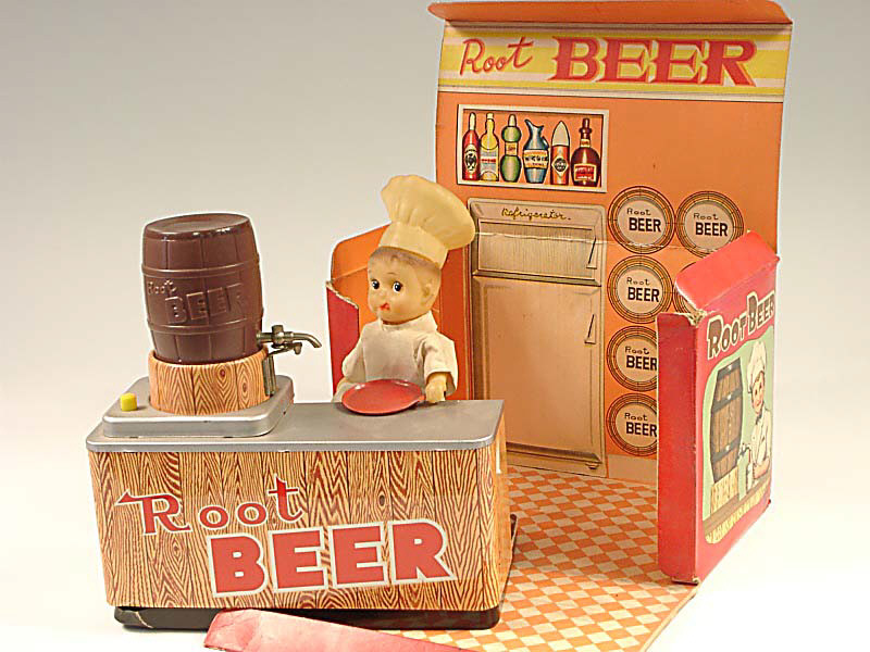 longueur 20 cm - en action le serveur tourne sur son tabouret vers le tonneau pour remplir son verre puis se retourne vers le client - mécanismes à revoir - avec boîte diorama & 2 verres - un petit enfoncement sur le socle - in action, the waiter swivels on his stool towards the barrel, then turns back towards the customer - mechanism subject to verification - with diorama box & 2 glasses