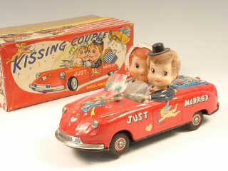 référence 42B du livre de BRIAN MORAN 'BATTERY TOYS' - longueur 27 cm - en action la CITROËN DS cabriolet avance en contournant les obstacles après les avoir heurtés - les 2 personnages tournent leurs têtes pour s'embrasser après quoi le conducteur rougit - l'oiseau sur le capot tourne sur lui-même & chante - mécanismes fonctionnent - in action, the CITROËN DS cabriolet moves forward & around objects after having collided with them - the 2 charcters turn their heads to kiss each other, after which the driver blushes - the bird on the bonnet turns in a circle & sings - in working condition