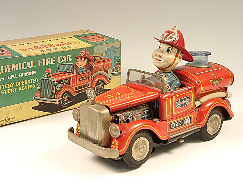 longueur 24 cm - en action le véhicule avance en contournant les obstacles après les avoir heurtés & la cloche des pompiers retentit - les capots du moteur se soulèvent - mécanismes fonctionnent - in action, the vehicle moves forward circling obstacles after colliding with them & the fire bell sounds - the engine bonnets lift up - in working condition