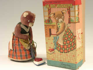 référence 15E du livre de BRIAN MORAN 'BATTERY TOYS' - hauteur 21 cm - en action le personnage se déplace dans tous les sens en passant son aspirateur qui s'allume - mécanismes non testés (manque boîtier de commande contenant les piles) - in action, the character vacuums in all directions, the hoover lights up - mechanisms not tested (missing remote control with batteries)