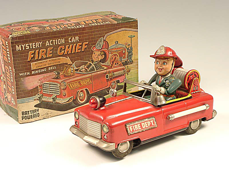 longueur 25 cm - en action la voiture avance tandis que le conducteur tourne le volant & que le feu rouge de capot s'allume - avec sonnerie - mécanismes à revoir - manque une attache latérale de tuyau & chromes légèrement oxydés - in action, the vehicle moves forward as the driver steers the wheel & the red bonnet light lights up - with bells - mechanism subject to verification - missing a side pipe holder & chrome slightly rusted