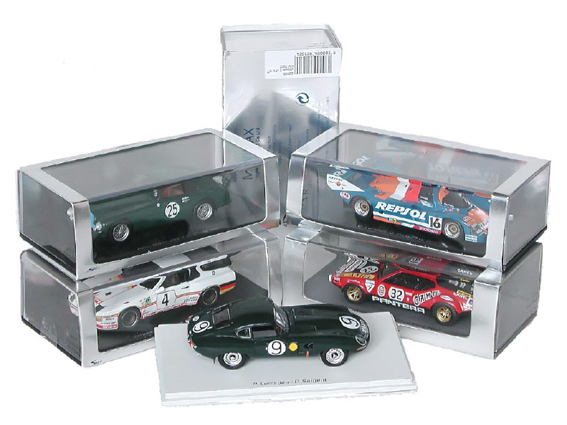 miniatures reproduisant les modèles : ASTON MARTIN DB2 1951, JAGUAR E 1962, DE TOMASO PANTERA 1972, PORSCHE 924 CARRERA GT 1980 & PORSCHE 962C 1990