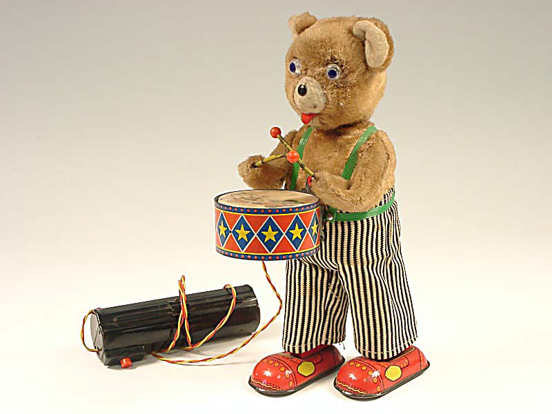 référence 10A du livre de BRIAN MORAN 'BATTERY TOYS' - hauteur 27 cm - en action l'ours avance en jouant du tambour tandis que ses yeux s'allument & sa tête bouge - mécanismes fonctionnent - in action, the bear moves forwards playing the drum, his eyes light up & his head moves - in working condition