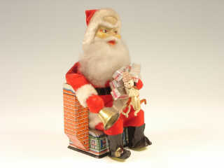 référence 71C du livre de BRIAN MORAN 'BATTERY TOYS' - hauteur 23 cm - en action le père-noël bouge les bras & la tête tandis que ses yeux s'allument - mécanismes fonctionnent (sauf celui du bras droit) - une botte légèrement déchirée - in action, Father Christmas moves his arms & head as his eyes light up - in working condition (except right arm) - one boot slightly torn