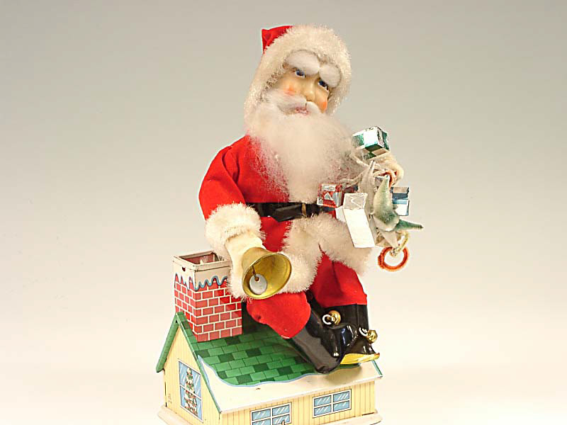 référence 79A du livre de BRIAN MORAN 'BATTERY TOYS' - hauteur 28 cm - l'action est déclenchée par l'introduction d'une pièce de monnaie dans la cheminée - le père-noël bouge les bras & la tête tandis que ses yeux s'allument - mécanismes fonctionnent - coin operated (slot in chimney) - in action, Father Christmas moves his arms & head as his eyes light up - in working condition