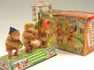 longueur 26 cm - mécanisme à clef (fonctionne) - en action les 3 petits singes jouent de la musique & le parasol tourne - key operated (in working condition) - in action, the 3 baby monkeys play music & the parasol twirls