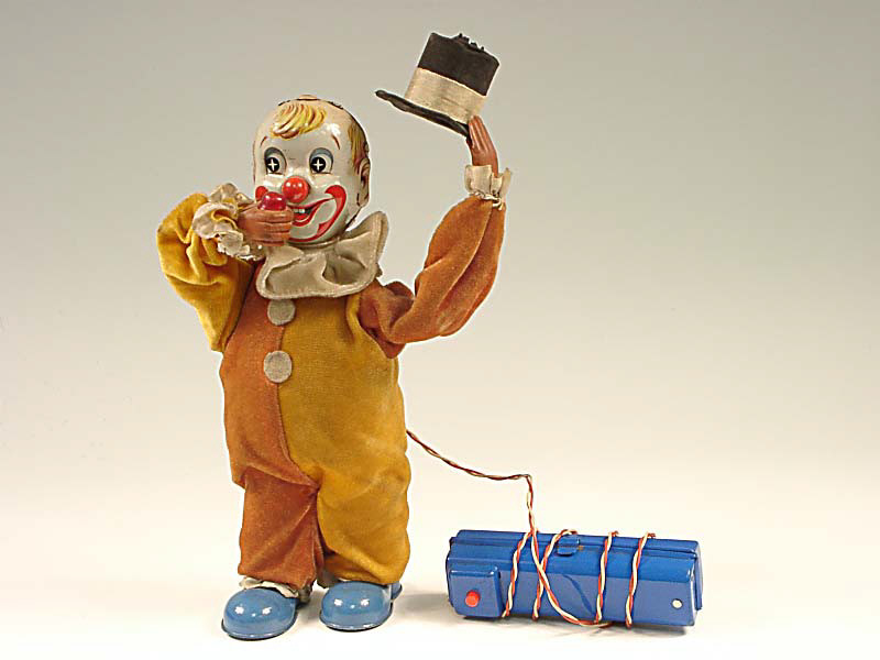 référence 52A du livre de BRIAN MORAN 'BATTERY TOYS' - hauteur 28 cm - en action le clown avance en fumant sa pipe qui s'éclaire - il soulève son chapeau & de la fumée sort du haut de son crâne - mécanismes à revoir - in action, the clown moves forward smoking his pipe which lights up - he lifts his hat and smoke comes out of the top of his head - mechanism subject to verification