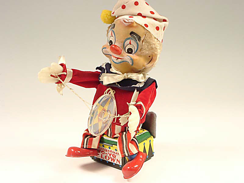 référence 55C du livre de BRIAN MORAN 'BATTERY TOYS' - hauteur 24 cm - en action le clown joue du yoyo tandis que son visage s'éclaire & qu'il fait des grimaces - il se balance de droite à gauche - mécanismes fonctionnent - in action, the clown plays with his yoyo as his head lights up & he pulls faces - he rocks from left to right - in working condition