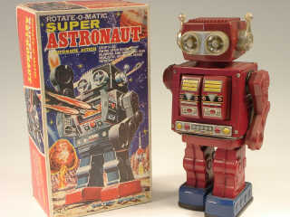 hauteur 30 cm - en action le robot avance puis stoppe - son torse s'ouvre & 2 canons en sortent - le buste se met alors à tourner sur lui-même avec des bruits de canons & des éclairs lumineux - mécanismes fonctionnent - parties chromées décolorées - in action, the robot moves forwards, then stops - his chest opens & 2 canons come out - his torso starts to turn in a circle with gunshot sound effects and light flashes - in working condition - chrome parts discoloured
