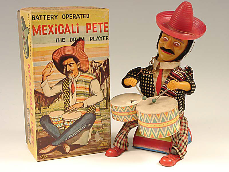 référence 50D du livre de BRIAN MORAN 'BATTERY TOYS' - hauteur 30 cm - en action le mexicain joue du tambour - il se tourne de droite à gauche & bouge la tête - mécanismes fonctionnent - une peau de tambour percée - in action, the Mexican plays the drums - he turns from left to right & moves his head - in working condition - one drum skin pierced