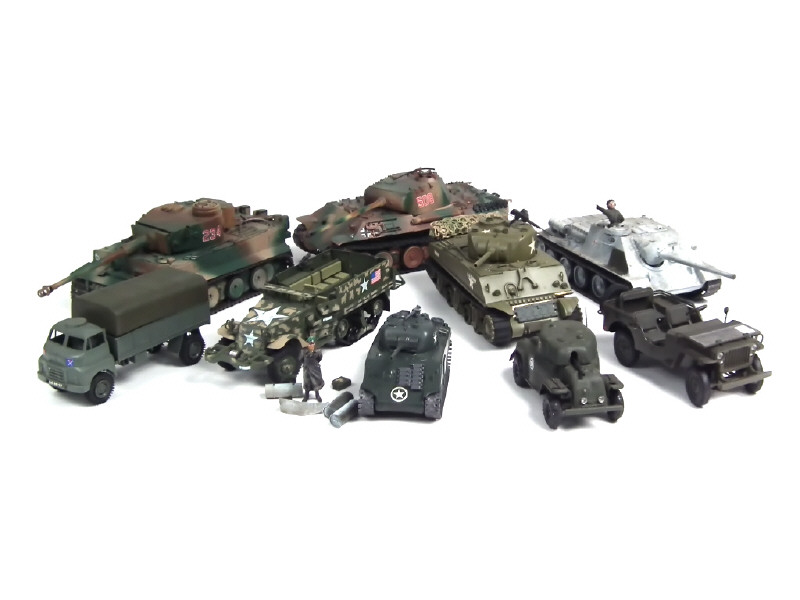 comprend : JEEP, HALF TRACK, BEDFORD bâché, automitrailleuse, 2 chars SHERMAN, TIGRE I, SU 100 & PANTHER - on y retrouve notamment les marques : MARK TOY, TAMIYA, GONIO & AIRFIX - avec manques & parties cassées - un modèle repeint & transformé - on y joint un ensemble de boîte vides (notamment des marques GORGI TOYS, BUCO & NZG)
