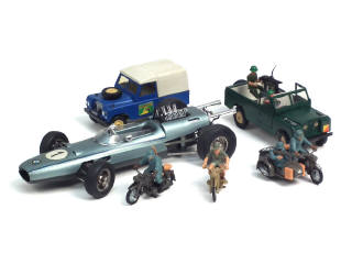 comprend : LAND ROVER (2 exemplaires différents dont un en état 'C' avec un rétroviseur manquant) & 3 motos de l'armée allemende dont une avec side-car - on y joint une BMW Formule 2 de grande échelle de la marque SCHUCO en état 'B'