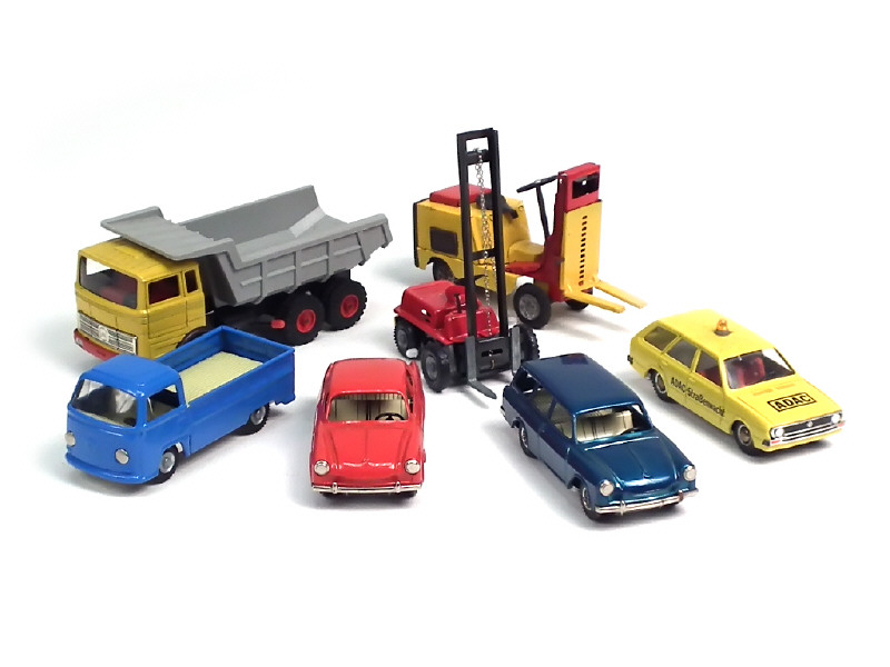 comprend : MERCEDES benne-carrière (quelques petites parties fondues sur la benne), VOLKSWAGEN combi pick-up, chariot-élévateur, VOLKSWAGEN 1600 TL (2 exemplaires différents), PASSAT break 'ADAC' - 2 rééditions de la marque KOVAP - on y joint un chariot-élévateur de la marque LINE-MAR TOY en état 'D' (un enjoliveur de roue manquant) - 5 modèles avec moteurs à friction (fonctionnent)