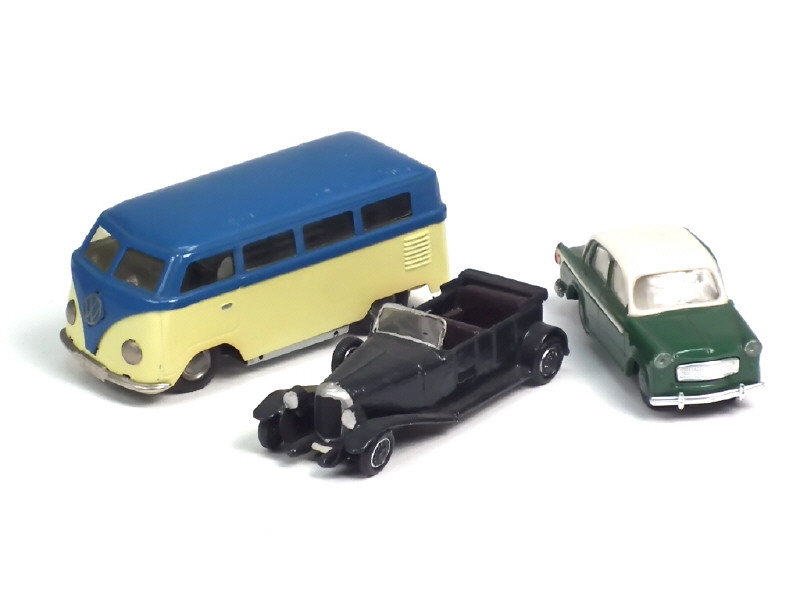états de 'A' à 'B' - comprend : VOLKSWAGEN COMBI (moteur à clef fonctionne), FIAT 1100 & MERCEDES torpédo (train avant déformé) - on y retrouve les marques : DUX, POLITOYS & RD MARMANDE