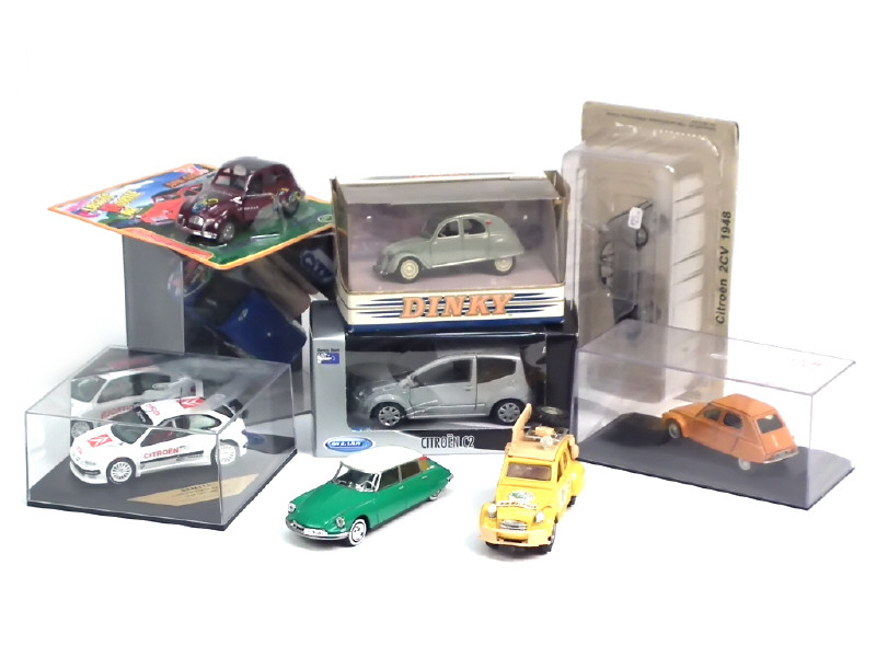 différentes échelles - comprend : C2, XSARA, DYANE, DS 19, 2 CV (4 exemplaires différents dont une en état 'C' avec carrosserie encrassée & l'autre avec blister de boîte incomplet) & BERLINGO - on y retrouve notamment les marques : VITESSE, DUVI, WELLY, DINKY MATCHBOX, MF & EDITIONS ATLAS - 2 véhicules sans boîte dont un avec une partie cassée
