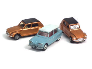 états de 'A' à 'B' - comprend : DYANE (2 exemplaires dont un avec roues & axes non d'origine & pneu de secours manquant) & AMI 6 en état 'E' - on y retrouve les marques : DINKY TOYS GB & CIJ
