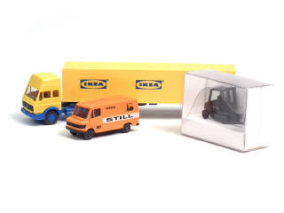 modèles promotionnels - comprend : MERCEDES semi-remorque fourgon 'IKEA' (attelage cassé), MERCEDES fourgonnette 'STILL' & STILL R70-25 chariot élévateur ave boîte en état 'b'