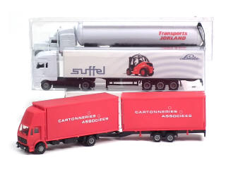 petite échelle - modèles promotionnels - comprend : PETERBILT semi-remorque citerne 'TRANSPORTS JORLAND', MAN semi-remorque 'SUFFEL LINDE' & MERCEDES fourgon avec remorque fourgon 'CARTONNERIES ASSOCIEES' (boîte en état 'd') - on y retrouve notamment la marque SIBUR