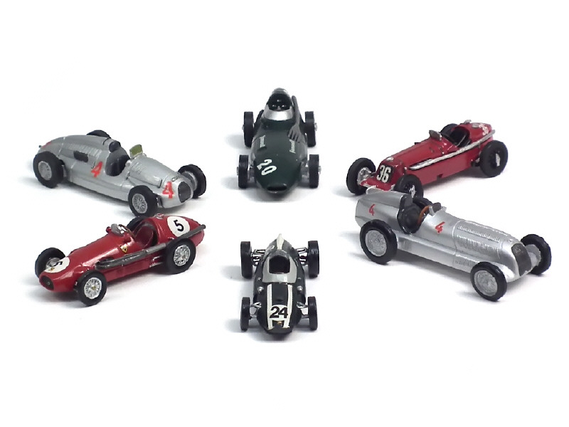 kits montés en métal - comprend : MERCEDES W 25, AUTO UNION, COOPER CLIMAX, FERRARI TIPO, MASERATI 8 CM (train avant déformé) & VANWALL - petits détails de peinture blanche ajoutés sur les planchers