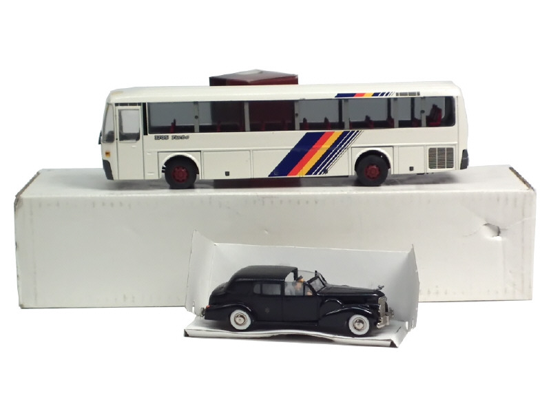 un éclat majeur & une trace d'étiquette autocollante sur le toit - carrosserie légèrement déformée par endroits - avec sachet de rétroviseurs & suremballage en carton - on y joint une CADILLAC coupé de ville du Vatican en état 'A.c' (pare-chocs arrière recollé) de la marque REXTOYS