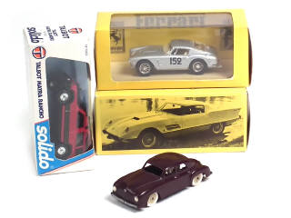 comprend : TALBOT MATRA RANCHO, FERRARI 250 GT, 410 SUPER FAST & RENAULT FREGATE (état 'C', une partie d'aile manquante & sans boîte) - on y retrouve les marques : MINIALUXE, IDEA3 & SOLIDO