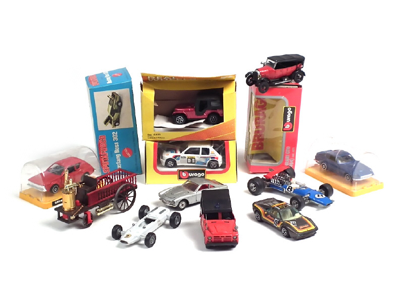 différentes échelles - états de 'A' à 'E' - miniatures reproduisant notamment les modèles : JEEP, GREMLIN, NISSAN, PEUGEOT, FERRARI (3 exemplaires différents), MATRA & FIAT (2 exemplaires différents dont un avec importantes traces de métal fatigue) - 4 modèles avec boîte dont une avec blister cassé - on y joint : 5 boîtes vides des marques MEBETOYS 4 exemplaires dont une incomplète) & BBURAGO
