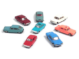 comprend : CHEVROLET CORVAIR, JAGUAR MK X, RENAULT 16, FIAT 2300, PEUGEOT 204 (2 exemplaires différents), 504 & 404 - carrosseries plus ou moins déformées & encrassées - 2 modèles avec suspensions affaissées - quelques manques