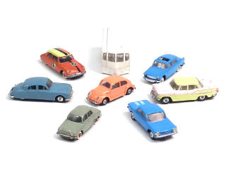 états de 'B' à 'D' - comprend : CHEVROLET CORVAIR, VOLKSWAGEN 1300, PEUGEOT 404 (toit ouvrant désolidarisé de son logement), JAGUAR 2.4 L, RENAULT DAUPHINE, CITROEN DS 19 (décorations ajoutées), SIMCA CHAMBORD & HENON (importantes traces de colle d'origine sur la carrosserie) - avec manques