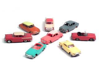 états de 'B' à 'E' - comprend : CITROEN DS 19, SIMCA OCEANE (2 exemplaires différents), VOLVO P1800, PEUGEOT 403, RENAULT FREGATE GRAND PAVOIS, SIMCA CHAMBORD & BEAULIEU - parties cassées & manquantes - quelques jantes plus ou moins fondues