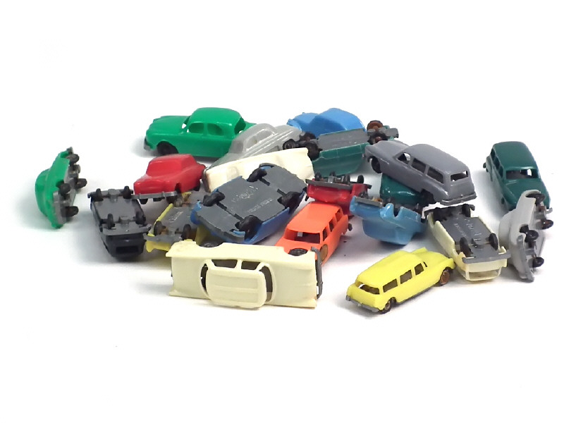 différentes échelles - états de 'B' à 'D' - miniatures reproduisant les modèles : RENAULT (6 exemplaires différents), SIMCA (5 exemplaires différents dont un avec une tache importante), PEUGEOT (5 exemplaires différents dont 2 avec pare-chocs cassés), CITROEN (2 exemplaires différents), PORSCHE (pare-chocs avant cassé) & AUSTIN HEALEY - quelques jantes & axes deroues oxydées