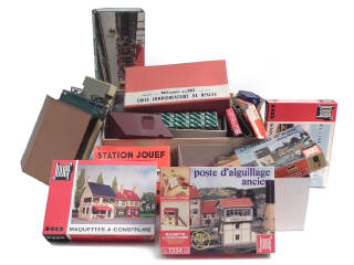 différents écartements - états de 'A' à 'F' - comprend notamment : maquettes (montées & non montées), carrosseries, sachets d'ampoules, petits berlingos d'huile, boucles d'attelages, 3 wagons, une voiture de voyageurs, rails & petits éléments divers dont certains jamais ouverts - on y retrouve les marques : HORNBY, JOUEF & EGGER-BAHN - quelques manques