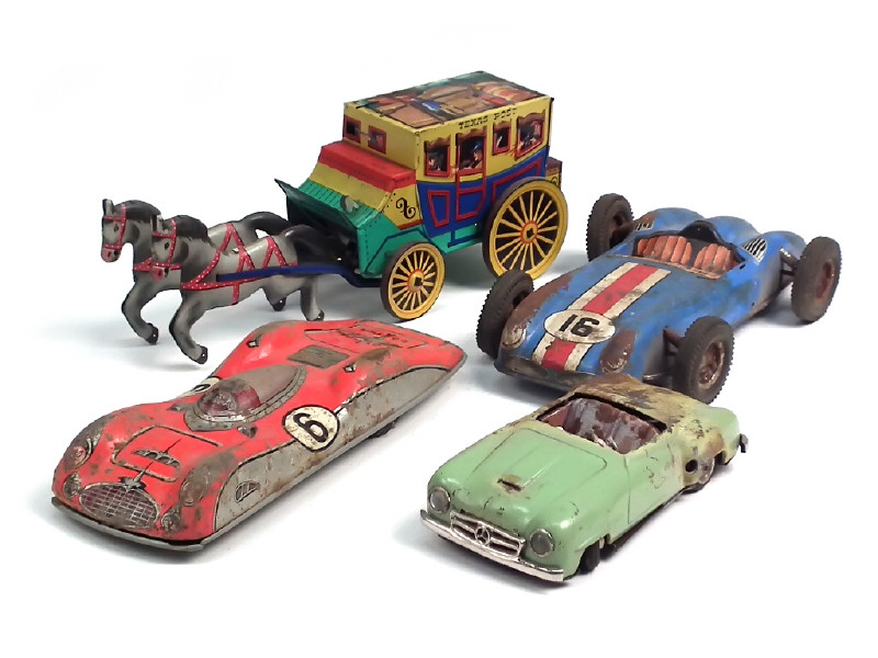 comprend : diligence, MERCEDES roadster, voiture de course & de records - nombreux manques avec importantes traces d'oxydation - on y retrouve notamment les marques : JOUSTRA & JNF