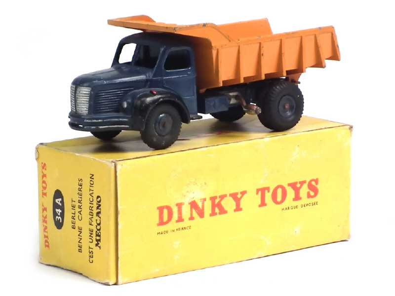 DINKY TOYS (FRANCE) 34A BERLIET Benne carrière MARREL (version avec jantes convexes) bleu foncé & orange