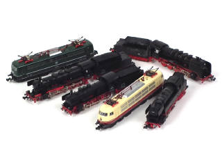 états de 'A' à 'B' - comprend : locomotives à vapeur type 150 avec tender (2 exemplaires différents dont une avec petites traces d'humidité), locomotive à vapeur type 230 avec tender, locomotive-tender à vapeur type 142, 2 motrices éléctriques type 103 118-6 & 151 032-D - non testés
