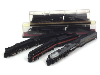 comprend : type 4-8-4 2113 'READING', type 4-6-6-4 3975 'UNION PACIFIC', type 4-8-4 610 'NORFOLK AND WESTERN', type 2-8-4 3790 'SANTA FE' (en boîte état 'b') & type 2-8-8-2 2172 'NORFOLK AND WESTERN' (en boîte état 'b') - on y retrouve les marques : BACHMANN, RIVAROSSI & RÖWA - non testés