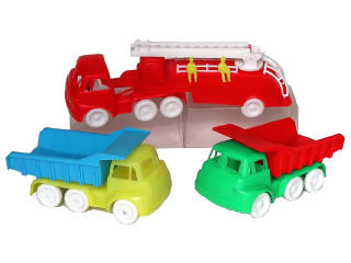 réalisations en plastique - comprend : pompier longueur 29 cm & 2 bennes de chantier longueur 17 cm - sous sachet plastique