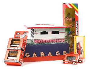 dimensions 21,5 x 14,5 cm - panonceau de toit cassé & incomplet - on y joint un coffret 'FARM MODELS', 2 râteliers, 2 boîtes de bidons de lait de la marque BRITAINS & une boîte vide référence 530 de la marque DINKY TOYS FRANCE en état 'b'