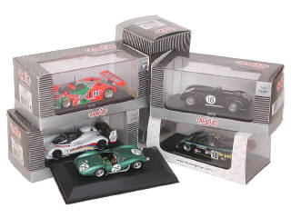 miniatures reproduisant les modèles : JAGUAR XK120C 1953, ASTON MARTIN DB3S 1953, RONDEAU M379B 1980, MAZDA 787B 1991 & PEUGEOT 905 1992