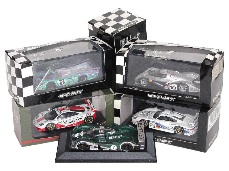miniatures reproduisant les modèles : Mc LAREN F1, PORSCHE 917L 1970, PORSCHE 911 GT1 1997, BENTLEY (boîte non conforme) & AUDI R8C 1999