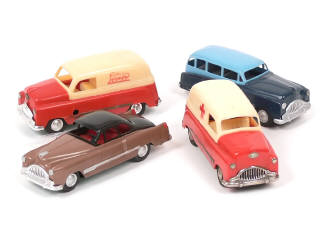 longueur : 12 cm - manque moteur & volant - un phare incomplet & un autre non d'origine - 2 jantes craquelées - partie amovible de la carrosserie non repeinte