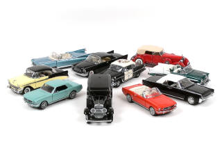 échelle 1/24ème - comprend : CADILLAC ELDORADO BIARRITZ 1959, CHEVROLET BEL AIR décapotable 1956 (manque certificat d'authenticité) , CHEVROLET BEL AIR 'POLICE CHIEF' 1955, CHEVROLET SPORT coupé 1956, CHRYSLER 300C décapotable 1957, CADILLAC IMPERIAL SEDAN 'AL CAPONE' 1930 (avec accessoires), LINCOLN CONTINENTAL MARK II 1961, PACKARD SEDAN cabriolet 1934, FORD MUSTANG coupé hard-top 1964 & FORD MUSTANG cabriolet 1964 - avec 9 certificats d'authenticité, un sachet de gants, accessoire & notices