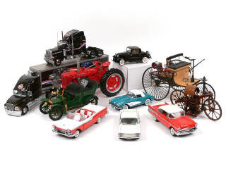 échelle 1/24ème - comprend : CHEVROLET CORVETTE 1959 (un accessoire), FORD V8 coupé DEUCE 1932 (avec certificat d'authenticité), CHEVROLET CORVETTE 1960 (avec accessoire), CHEVROLET CORVETTE 1957 (avec accessoire), CHEVROLET BEL AIR 1957 (2 exemplaires différents avec certificats d'authenticité), FORD MODEL T 1913 (échelle 1/16ème, avec certificat d'authenticité), FARMALL tracteur agricole 1941 (échelle 1/12ème, avec certificat d'authenticité), MACK ELITE CL 613 (échelle 1/32ème, un petit élément à recoller), BENZ PATENT MOTORWAGEN 1886 (échelle 1/8ème, avec certificat d'authenticité), PETERBILT tracteur 379 avec remorque réfrigérée (échelle 1/32ème), DAIMLER REITWAGEN 1885 (avec certificat d'authenticité), ROLLS ROYCE 10 CV 1905 (échelle 1/16ème, avec certificat d'authenticité & petits éléments à recoller), CHEVROLET CORVAIR MONZA 1960 (avec certificat d'authenticité), ROLLS ROYCE roadster 1910 (avec accessoires) & FORD FAIRLANE 500 SKYLINER 1957 (avec certificat d'authenticité & accessoire)