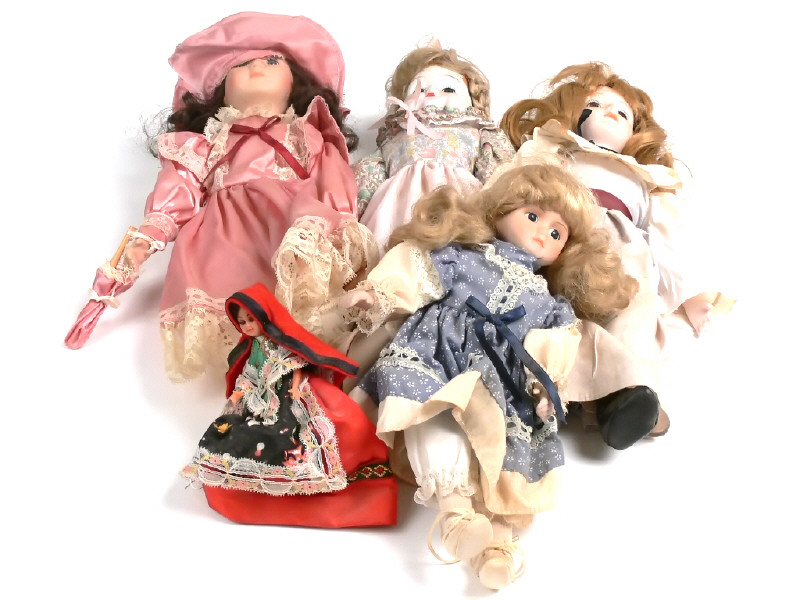 comprend : 3 exemplaires (40 cm) des marques 'CLASSIQUE COLLECTION' & CK (porcelaine, corps en tissu), un autre (28 cm - porcelaine & corps en tissu) & un dernier (15 cm) en plastique